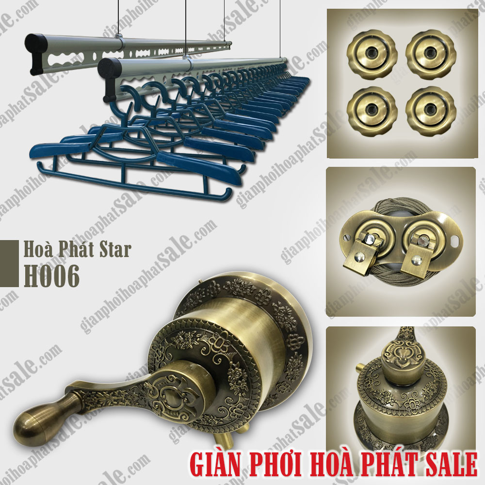 Giàn phơi cao cấp Hòa Phát H006 có thiết kế tay quay liền sang trọng, hiện đại. Bộ tời được đúc với kích thước lớn hơn rất nhiều so với bộ tời thông thường và được tạo nhiều họa tiết, hoa văn trang trí đẹp mắt.